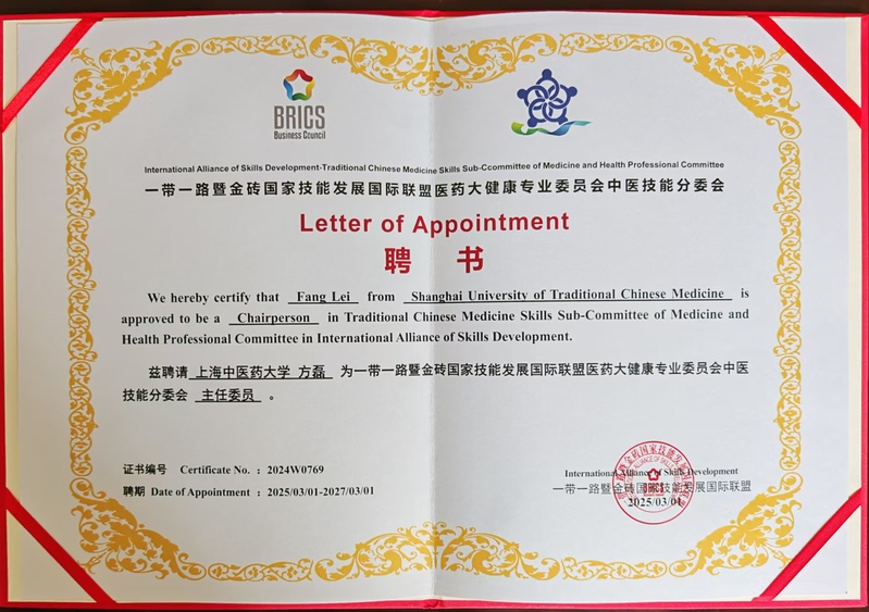 2025年3月,上海中医药大学康复医学院方磊教授在厦门一带一路暨金砖国家技能发展与技术创新大赛医药大健康类赛项竞赛规程与标准制定会议暨未来技术技能与人文交流人才国际训练基地(金砖工坊)建设工作会议中取得重要学术突破。在一带一路暨金砖国家技能发展国际联盟医药大健康专委会成立大会上,方磊教授受聘为首届中医技能分委会主任委员,标志着中医药国际化发展迈出关键一步。