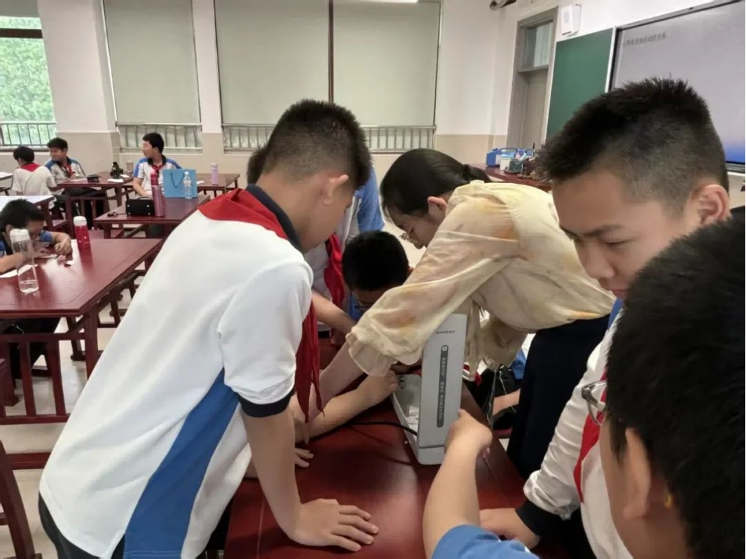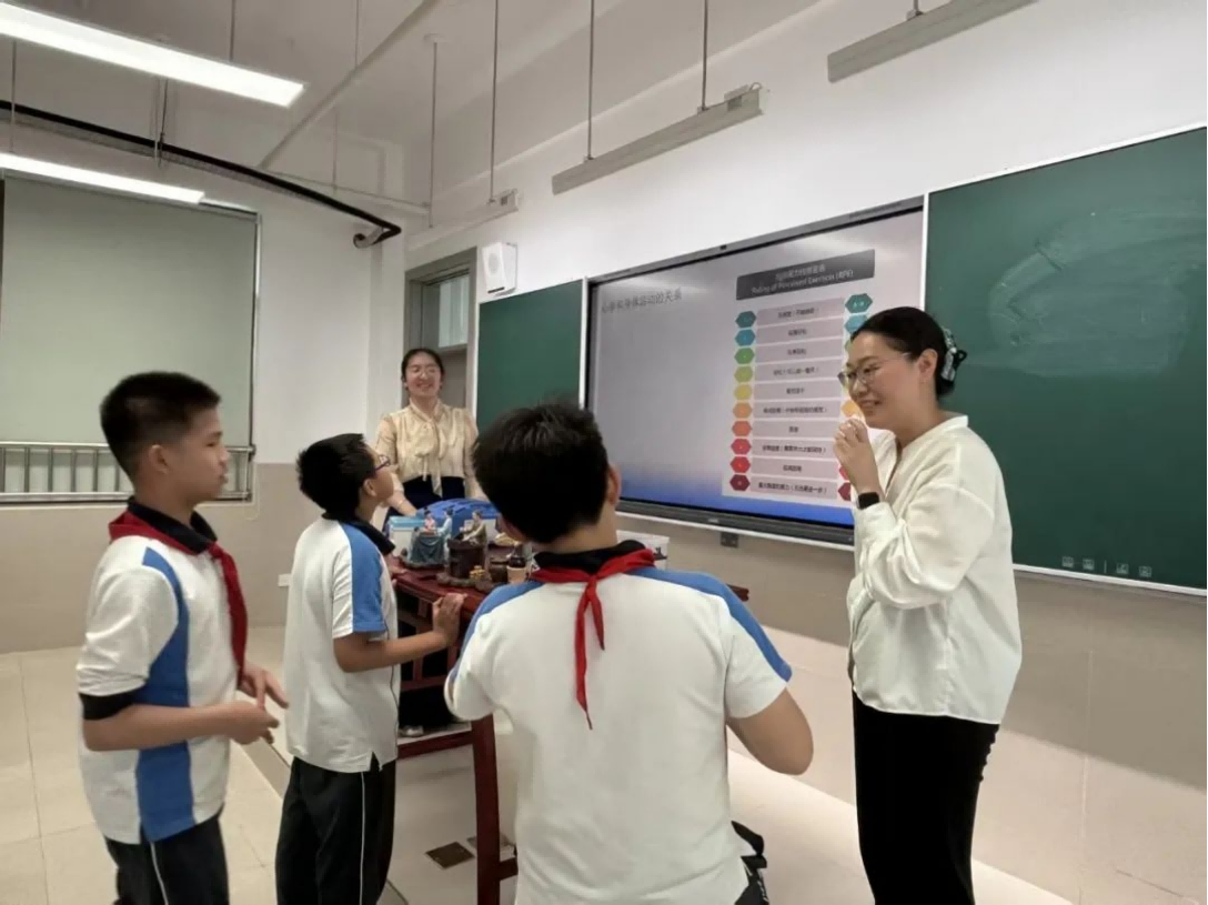 活动中,老师们与志愿者共同设计了多项沉浸式体验环节。在“感受心跳”环节,学生通过摸脉,感受脉象的从容和缓、柔和有力,接着通过指脉氧量化心率、血氧指标,观察静息状态和运动后的心跳变化,直观感受心脏节律与健康的关联。在“血压探秘”小实验中,学生们在老师和志愿者的指导下尝试用水银血压计互相测量,学习正确监测血压的方法。