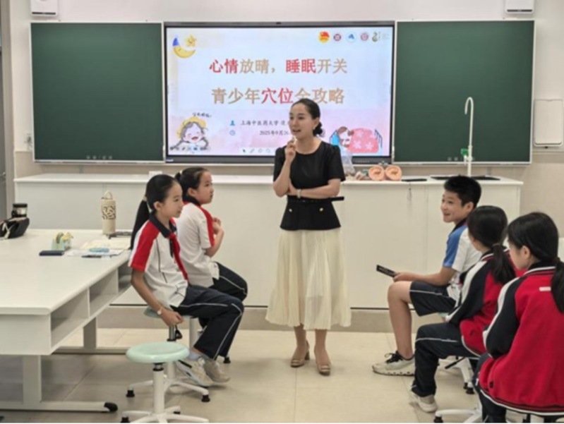 2025年9月26日,康复医学院“岐黄轩”志愿者服务队走进上海中医药大学附属浦东实验中学中医药文化社团开展主题为“心情放晴,睡眠开关”的青少年穴位全攻略课程。本次课程由上海中医药大学康复医学院汤康敏老师主讲,学生杨晨曦、杨晶晶任助教,廖梓萌、盛可煜担任志愿者,旨在通过互动教学、实践操作与趣味游戏,向青少年普及中医穴位知识,助力其改善睡眠质量、缓解日常压力。