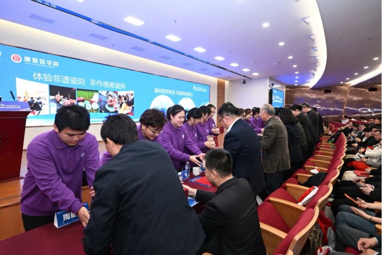 大会特别设置献礼环节,康复医学院学生通过亲手制作的非遗瓷刻作品,向恩师和产业导师表达感恩之情;学院也为校友们准备了印有校园风景与导师寄语的纪念折扇,展现学院深厚的文化底蕴和育人成果,以及师生之间的深厚情谊。