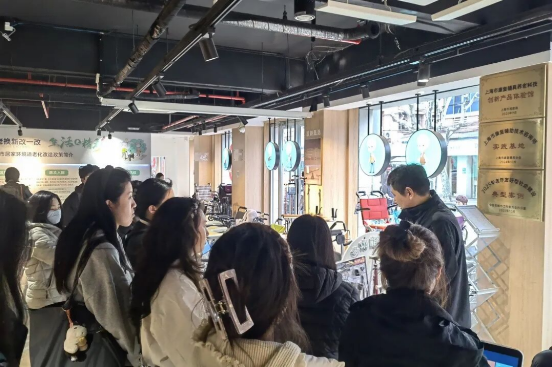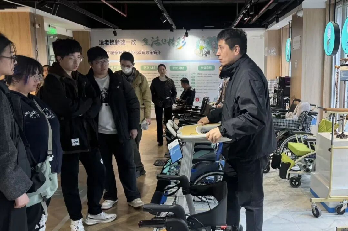 抵达假肢厂后,同学们先在潘秀江老师的带领下参观和体验了康复辅具养老科技创新产品体验馆。在体验馆,潘老师先向同学们介绍了各类常见的康复辅助器具。从不同类型的拐杖、轮椅,到康复鞋、功能性服装,再到无障碍厨房、卫生间及卧室等生活环境的设计,同学们在随后的体验中,对辅助器具在日常生活中的应用有了更加直观的认识。在讲解过程中,潘老师强调康复设计需兼顾安全性与实用性,以患者实际需求为核心,帮助其更好地融入日常生活。