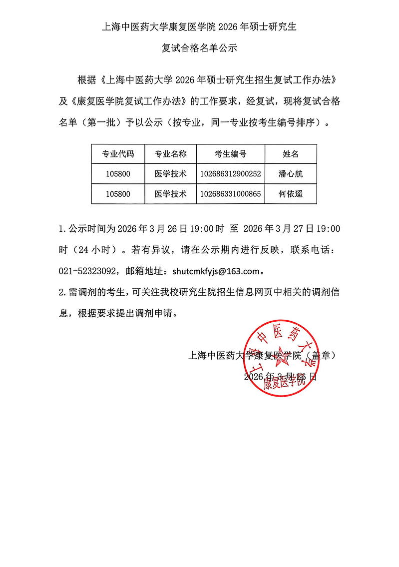 上海中医药大学康复医学院2026年硕士研究生复试合格名单公示(第一批)