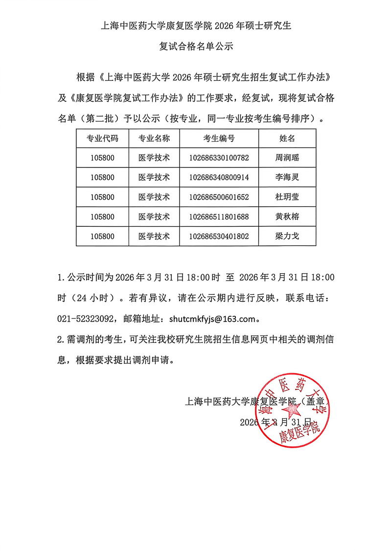 上海中医药大学康复医学院2026年硕士研究生复试合格名单公示(第二批)
